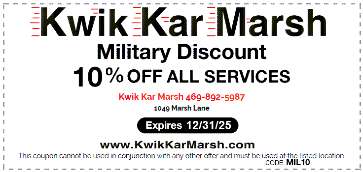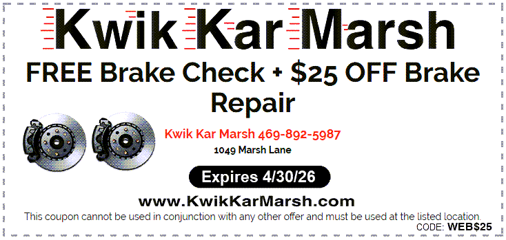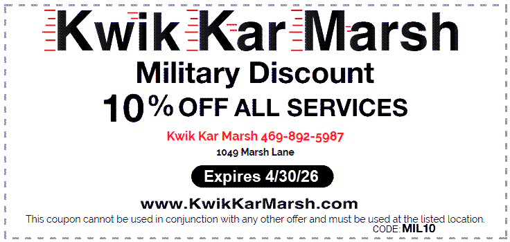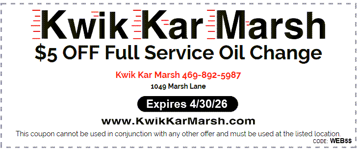 Kwik Kar Lube and Auto Repair is located at 1049 Marsh Ln, Carrollton, TX 75006. In addition to a great full service Oil Change in Carrollton, Kwik Kar Marsh also does Brakes, State Inspections in Addison, Wheel Alignments, A/C Service, Tune-Ups, Belts and Hoses as well as full service Auto Repair in Farmers Branch on ALL makes and models of cars and trucks. We take pride in taking great care of our Addison, Carrollton and Farmers Branch residents.