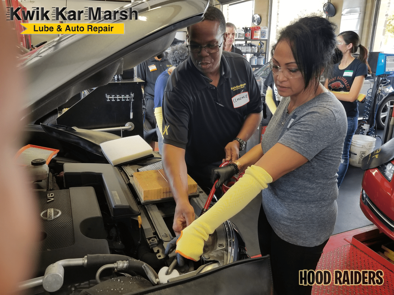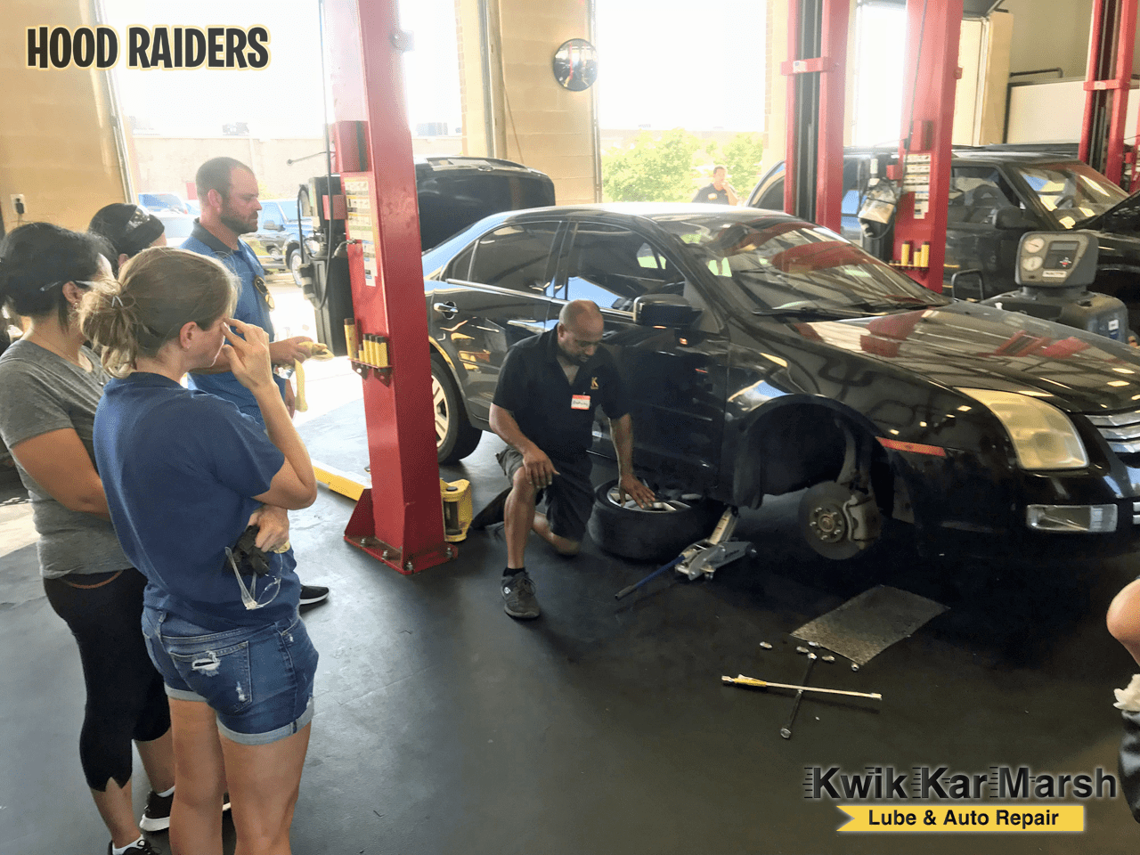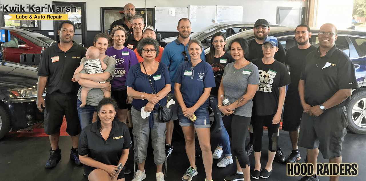 The first Kwik Kar Marsh “Hood” Raiders Academy class recently took place.  Here are photos of the first official “Hood” Raiders graduates.  The women and men learned how to service and maintain their cars by changing the oil and oil filter, checking the fluids, changing tires, changing windshield wipers and more.