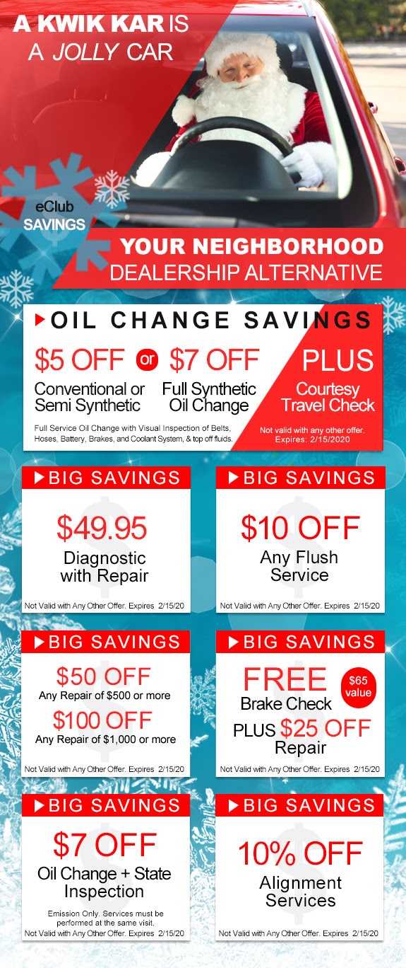 Kwik Kar coupons for December 2019 will save you money on oil changes, State Inspections, brakes and auto repairs. Kwik Kar Marsh is your local dealership alternative and is open seven days a week. Kwik Kar coupons can be used anytime. Save big with Kwik Kar coupons and our family wishes you a Happy Holiday.