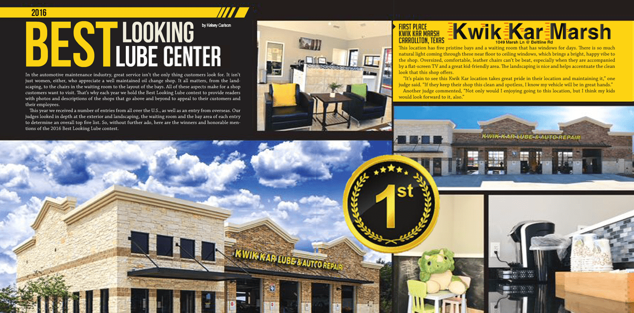 The first place title and the nation’s Best Looking Lube Center in 2016 was Kwik Kar Marsh, a beautiful oil change and auto repair shop that serves customers in Addison, Carrollton, Farmers Branch, Plano and Dallas.